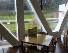 公園に突き出た2F東にカフェがあります。カフェからは、南側の「浮島」に設けられた「八角堂」が望むことができ、